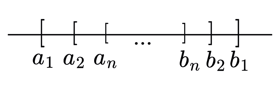 $\textbf{Theorem 1.8.:} $ (Nested Interval Theorem) If $I_n = [a_n, b_n]$, $n=1,2,3,\dots$ is a set of nested intervals such that $I_1 \supset I_2 \supset \dots$ and $\lim_{n\rightarrow \infty} (b_n-a_n) = 0$, then $(I_n)$ converges to a exactly one unique point.