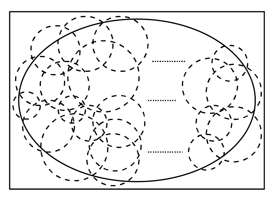 We have the union of infinitely many open sets that covers the E. The following figure shows what could it look like to form a open cover. Remember that, I have limited technology to depict infinity. Therefore, think these open sets as if they are infinitely many. However, mathematicians also thought about it, and as a result they made up finite subcover.